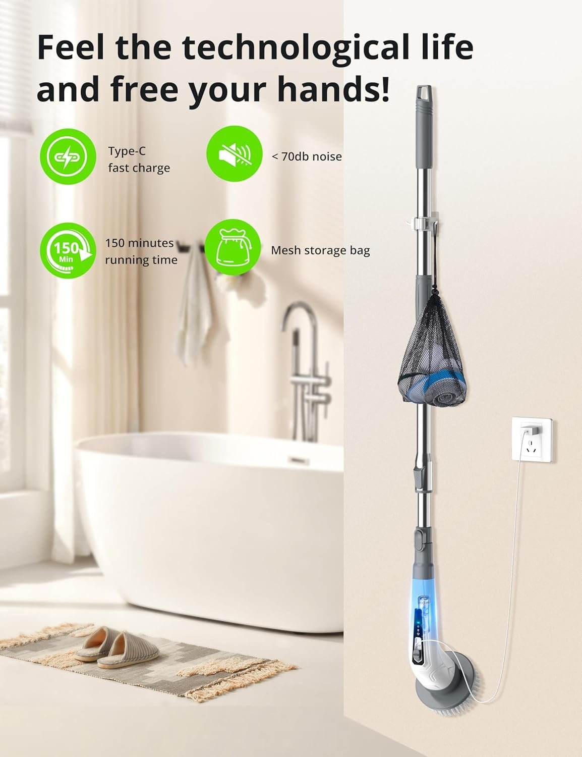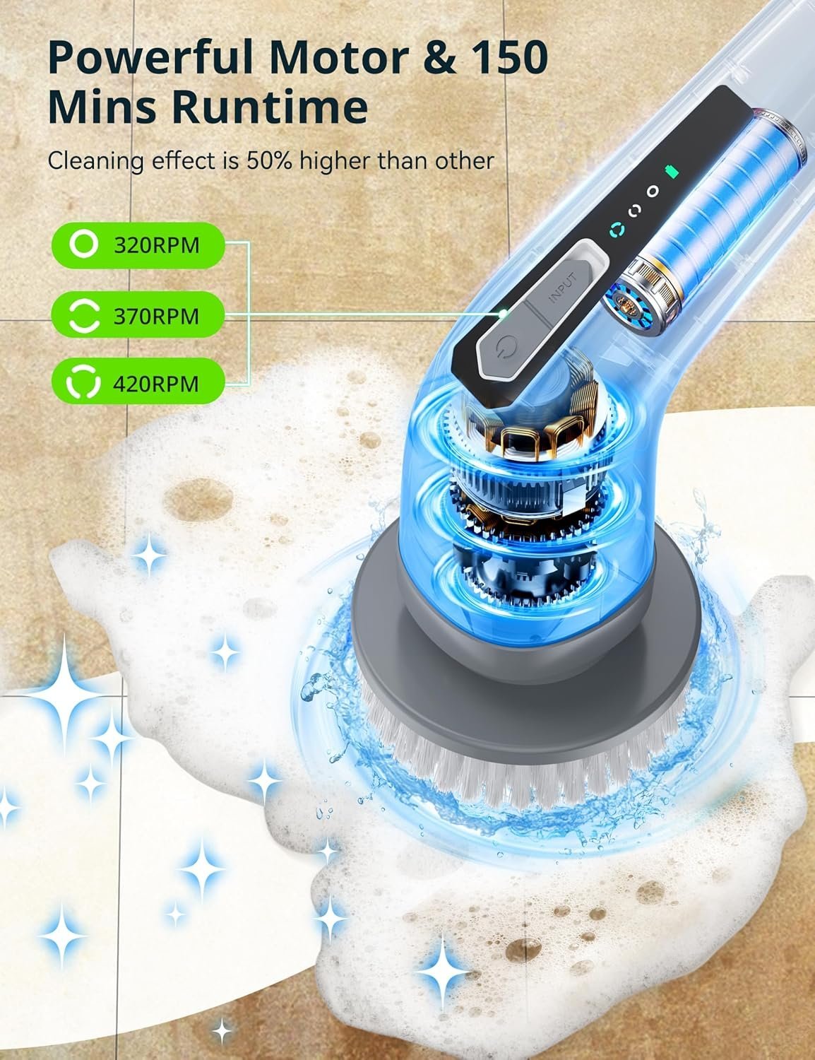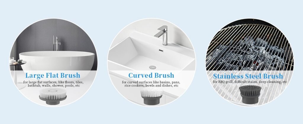 • Powerful and Adjustable Design: This shower scrubber combines power and convenience. It features a cordless design that gets rid of the cord. Equipped with a powerful motor, electric scrubber has superior cleaning ability to effectively remove stubborn stains and dirt. It has three adjustable speed settings (320RPM, 370RPM, 420RPM) so you can customize the cleaning intensity as needed. The low speed setting is perfect for gently cleaning delicate surfaces, while the high speed setting tackles the most stubborn dirt. And with a 150-minute battery life, you can keep cleaning without interruption.